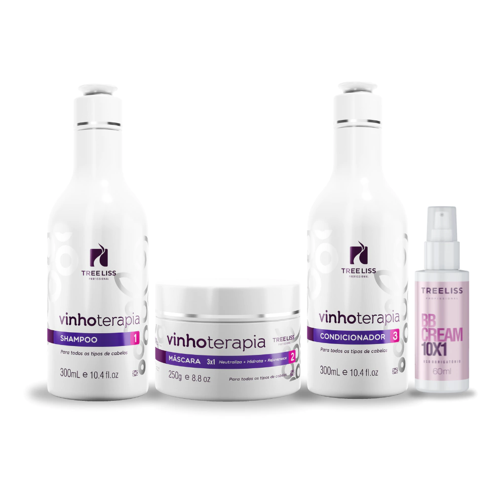 Kit Vinhoterapia com Shampoo, Condicionador, Máscara e BBCream Treeliss Profissional: Reparação intensiva para cabelos delicados ou fragilizados por processos químicos.