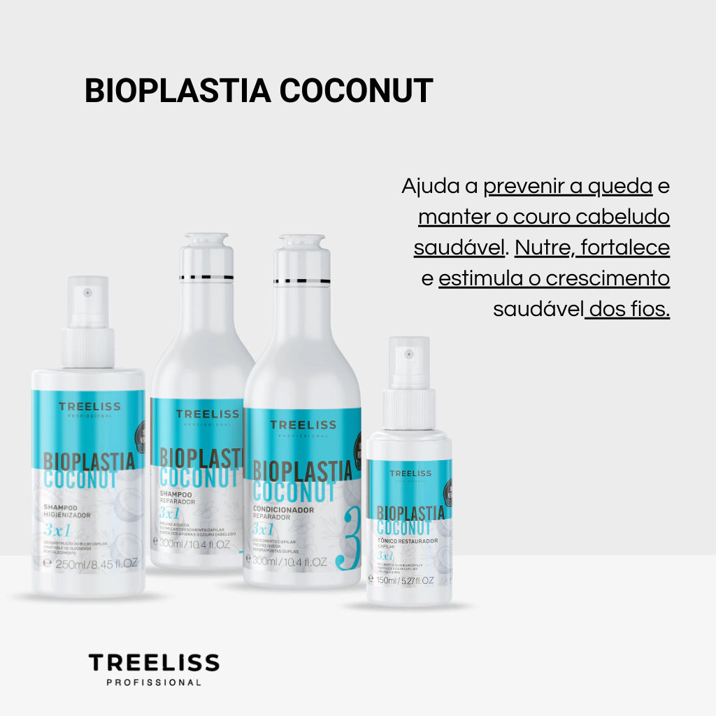 A linha Bioplastia Coconut Treeliss Profissional foi especialmente desenvolvida para tratar e fortalecer toda a cadeia capilar, prevenir e tratar a queda de cabelo, doenças do couro cabeludo, como a caspa, seborreia, e dermatoses, além de estimular o crescimento saudável dos fios, conferindo-lhes mais força e vitalidade. Feita com ingredientes naturais e Vegana, sem componentes de origem animal.