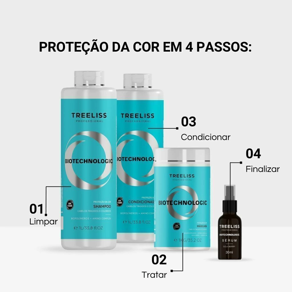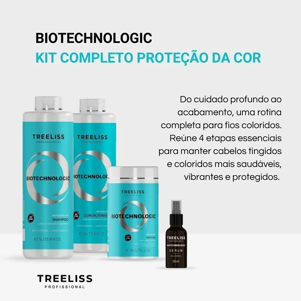 O Kit Tratamento Completo Proteção da Cor Biotechnologic reúne quatro etapas essenciais para manter cabelos tingidos e coloridos mais saudáveis, vibrantes e protegidos. Da limpeza à finalização, garante hidratação, fortalecimento, preservação da cor e brilho intenso, em um só conjunto.