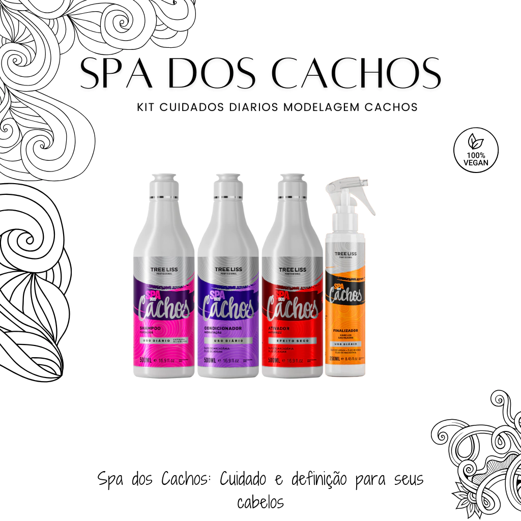 A linha Spa dos Cachos Treeliss Profissional foi cuidadosamente desenvolvida para tratamento de cabelos cacheados e crespos, com ativos naturais, 100% veganos, livres de petrolato, sulfetos e metilparabenos, para garantir máxima hidratação, saúde e resgate da beleza natural dos cachos.