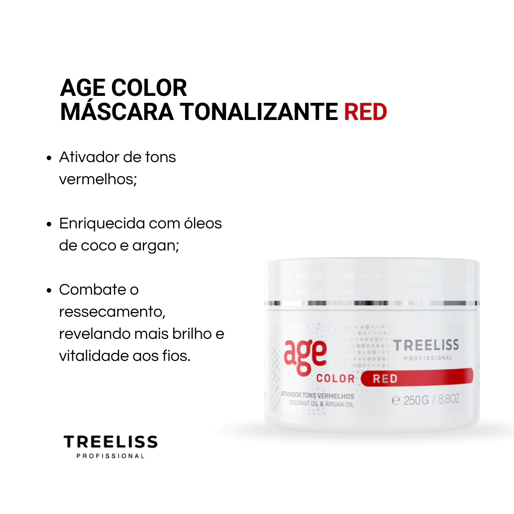 O Matizador Age Color Red Ativador de Tons Vermelhos Treeliss Profissional é a solução! Uma máscara tonalizante especialmente formulada para realçar e dar vitalidade aos cabelos vermelhos. Ela age eliminando os tons indesejáveis que podem surgir devido à exposição ao sol ou processos químicos.